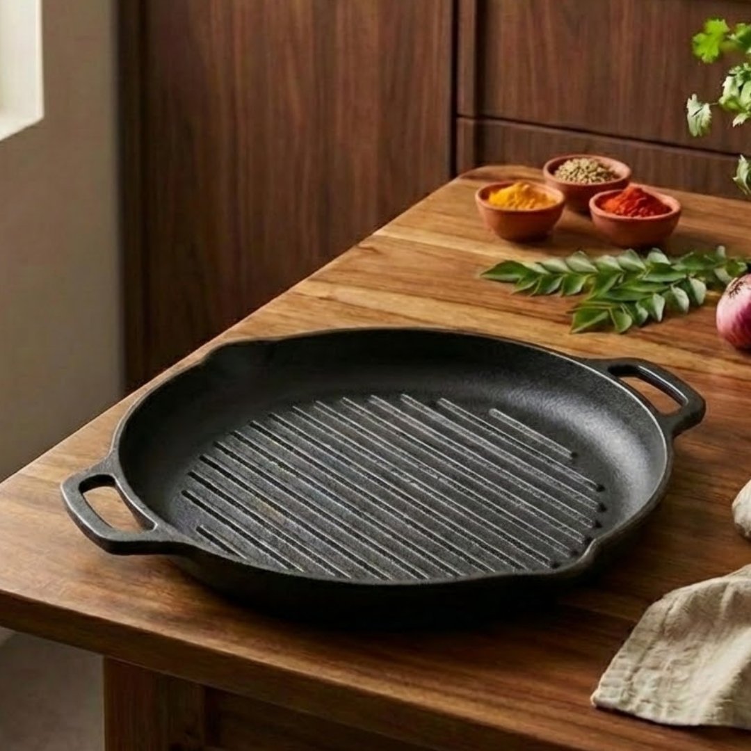 - Cast Iron Grill Pan for Indian Cooking – Handcrafted by Earth Chakra, this traditional yet modern pan is perfect for everyday Indian meals like tikkas, kebabs, and stir-fries.